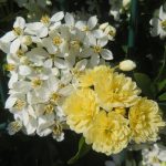 10/04/25 IMG_9749 Rosier de Lady Banks et oranger du Mexique, au jardin botanique d’Issy les Moulineaux, 92.