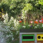 Poubelle bien fleurie dans le square Antoine Blondin, quartier de Charonne, 20e.
