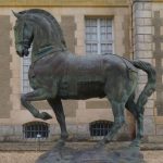 Cheval du monument à Alvear, oeuvre d’Antoine Bourdelle, 1861-1929, devant le château de Coubertin à st Rémy les Chevreuse, 91.