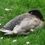 Sieste d’un canard colvert, Anas platyrhynchos, de couleur atypique, dans le jardin de l’hôtel d’Assy, aux archives nationales, quartier du Marais, Paris centre.