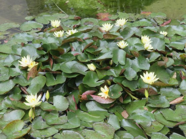 Belle touffe de nénuphar, Nymphea X, dans le canal du jardin Martin Luther King, 17e.