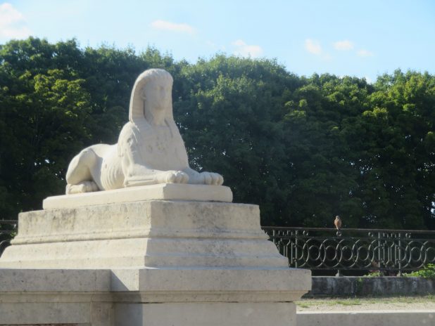 Sphinx et faucon crécerelle, sur la terrasse de la folie de Bagatelle, 16e.