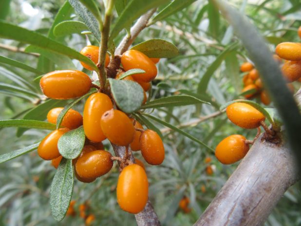 Fruits d’argousier dans le jardin des » Plateaux sauvages « , quartier de Ménilmontant, 20e.