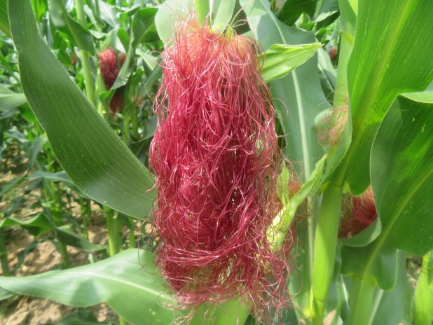 Flamboyante chevelure d’une infrutescence de maïs, Zea mays, dans la campagne bretonne, à Montours, 35.
