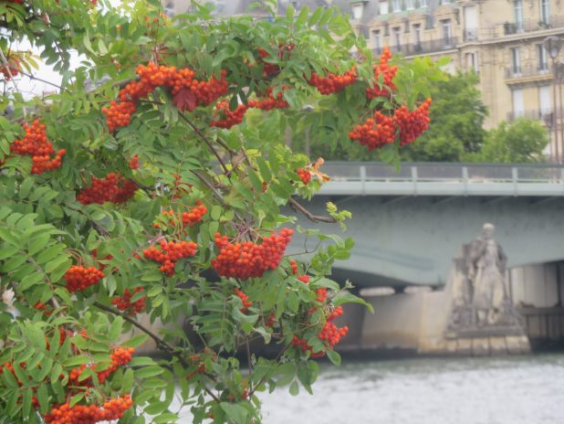Fructification d’un sorbier des oiseleurs, dans l’archipel Nikki de St Phalle, sur fond de zouave du Pont de l’Alma, au cours de la balade en bords de Seine, 7e