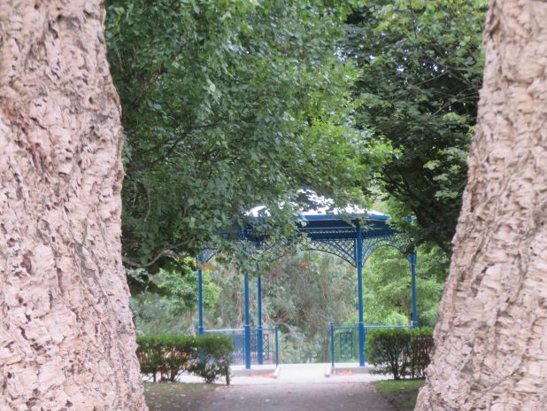 Kiosque à musique majorellien, entre deux troncs de chênes liège, au jardin des plantes de St Nazaire, 44.