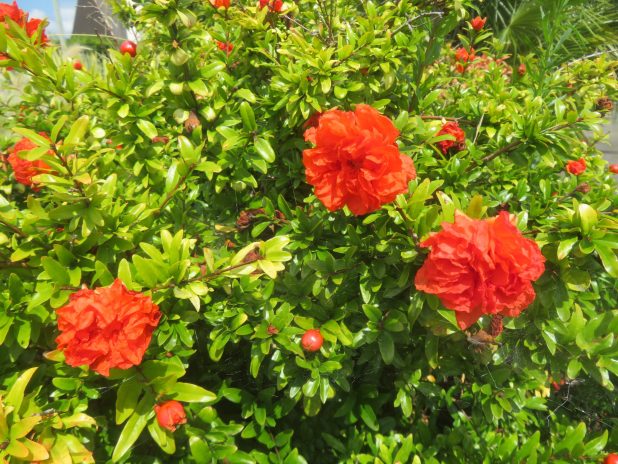 Floraison d’un grenadier nain, Punica granatum ‘nana’, dans un massif de rue à Savenay, 44.