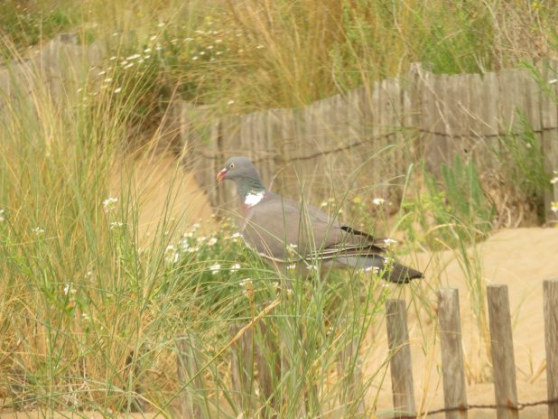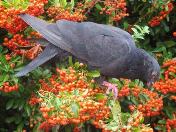 Pigeon se gobergeant de fruits de Pyracantha, près du bassin de la Villette, 19e.
