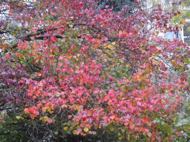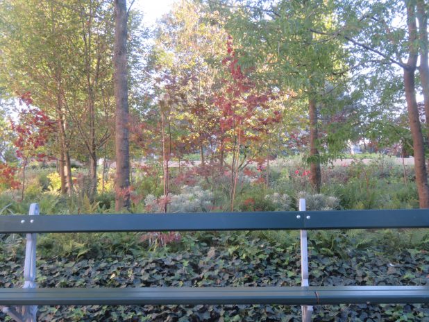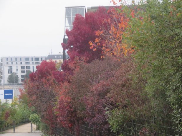 Rougeoiement des frênes ‘Raywood’, au jardin Rosa Luxemburg, quartier de la Chapelle, 18e.