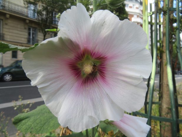 Rose trémière butinée par un bourdon, en pied d’arbre, rue Ordener, quartier de la Goutte d’Or, 18e.