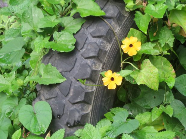 Sourire de Zanzibar, Thumbergia elata, submergeant un pneu abandonné dans un massif pour illustrer le thème de fleurissent estival de 2025: « La nature dompte la ville ». Square st Bernard, quartier de la Goutte d’Or, 18e.