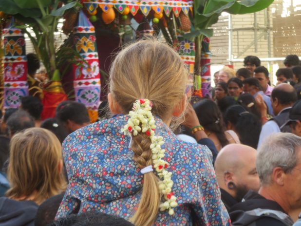 Jeune fille aux cheveux parés de jasmin d’Arabie, Jasminum sambac, pour voir passer Ganesh sur son char, quartier de la Chapelle, 10/18e.
