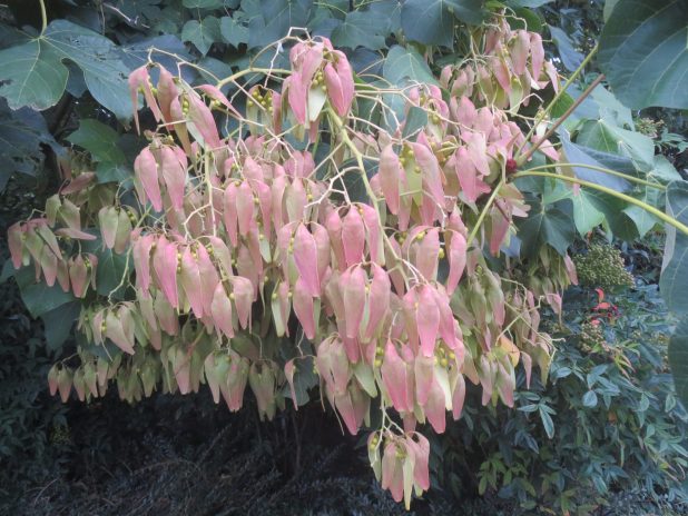 Abondante fructification d’un « parasol chinois », Firmiana simplex, au jardin Nelson Mandela, Paris centre.