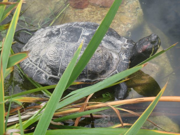 Bain de soleil d’une tortue de Floride, dans le bassin au pied du grand rocher, à la folie st James, 92.