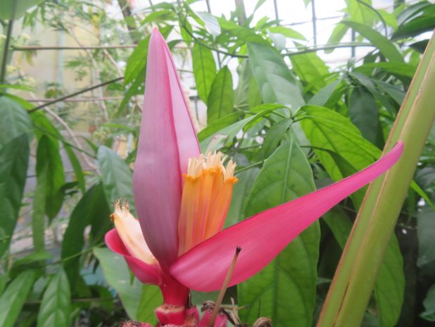 Inflorescence d’un bananier, Musa ornata, dans une serre du jardin d’Auteuil, 16e.