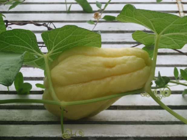 Fruit de chayotte, Sechium edule, installé sur le toit de la serre du jardin insolite, au parc floral, 12e.