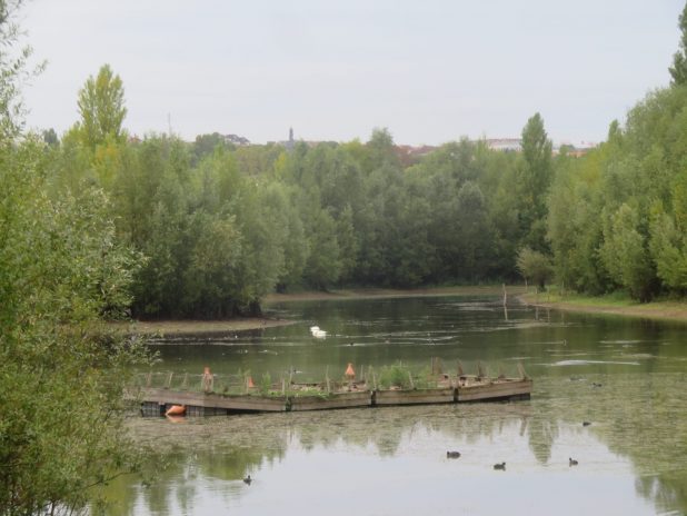 Radeau sur lequel ont niché cette année plusieurs couples de sternes pierregarins, au parc de la Haute Île, 93.