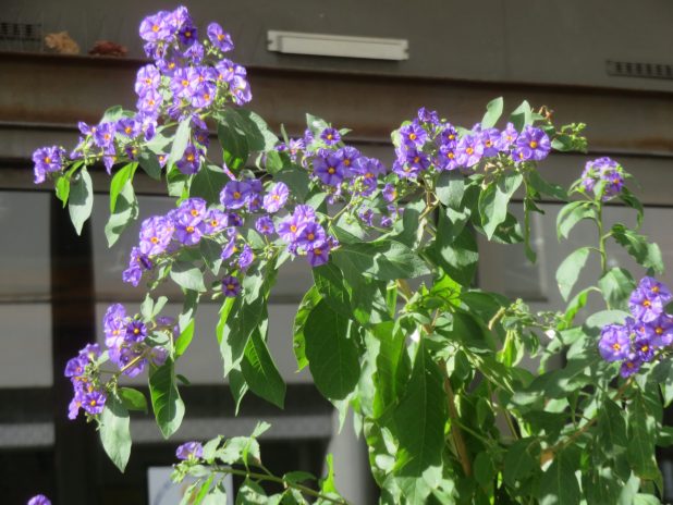 Beau Solanum rantonnetti, en pied d’arbre dans la rue des Gardes, quartier de la Goutte d’Or, 18e.
