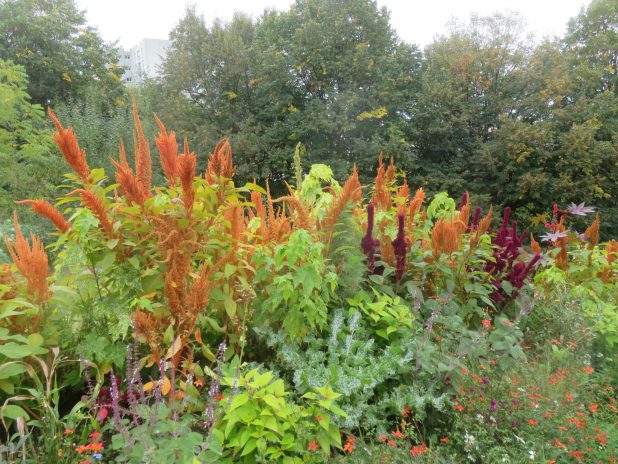 Massif de fleurs annuelles, surtout des amarantes, en sursis au jardin de Belleville, 20e.