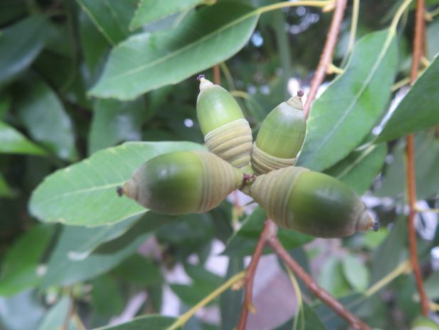 Conciliabule de petits glands de chêne à feuilles de myrsine , Quercus myrsinifolia, au parc de la Villette, 19e.
