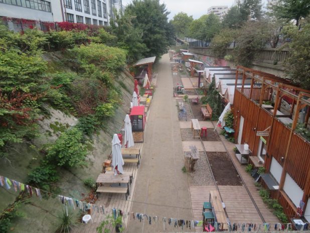 Jour tranquille au jardin Marielle Franco, sur fond de gare de l’Est, parcours du fbg st Martin, 10e.