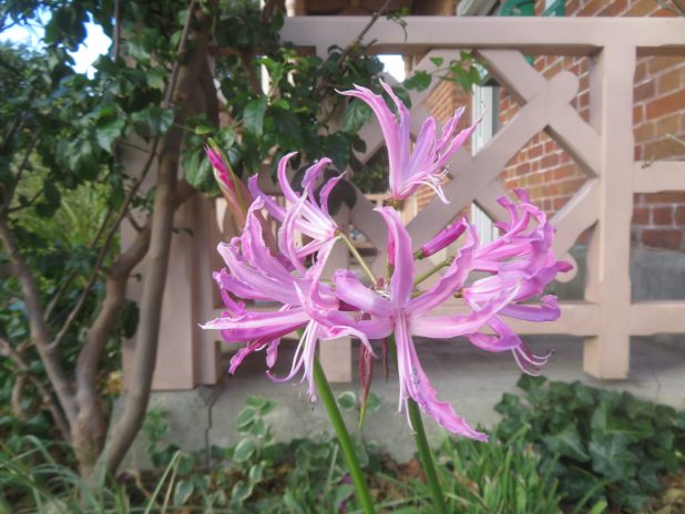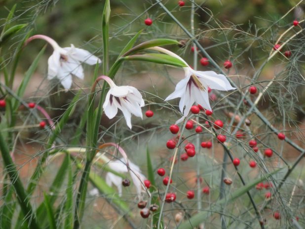 Fleurs de glaieul d’Abyssinie, Acidanthera murielae, mêlées aux fruits d’asperges, Asparagus officinalis, dans le potager/verger du parc de Bagatelle, 16e.