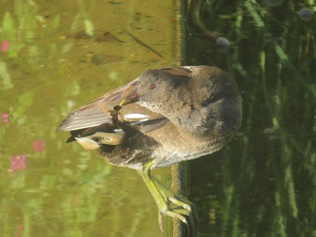 Jeune poule d’eau équilibriste, lissant ses plumes au parc Martin Luther King, 17e.