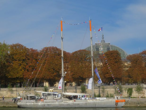 Goélette scientifique Tara amarrée au pied du Grand palais, 8e, depuis la rive gauche durant la balade en bords de Seine, 7e.