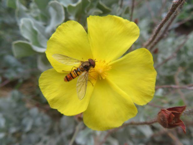 Syrphe ceinturé, Episyrphus balteatus, butinant un Cistus atriplicifolius, au jardin des serres d’Auteuil, 16e.