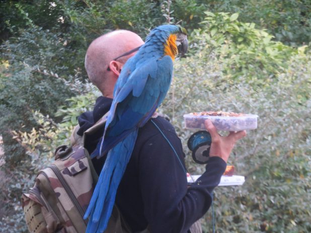Goûter d’un ara bleu et jaune, Ara ararauna, au parc des Buttes Chaumont, 19e.