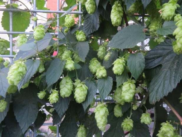 Houblon grimpant sur une grille, dans un escalier menant au Jardin des Traverses, à la fin de la balade dans le quartier Amiraux Simplon, 18e.