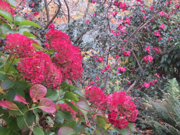 La vie en rouge dans le coin des Hydrangea et des Camellia sasanqua, à l’arboretum de la Vallée aux Loups, 92.