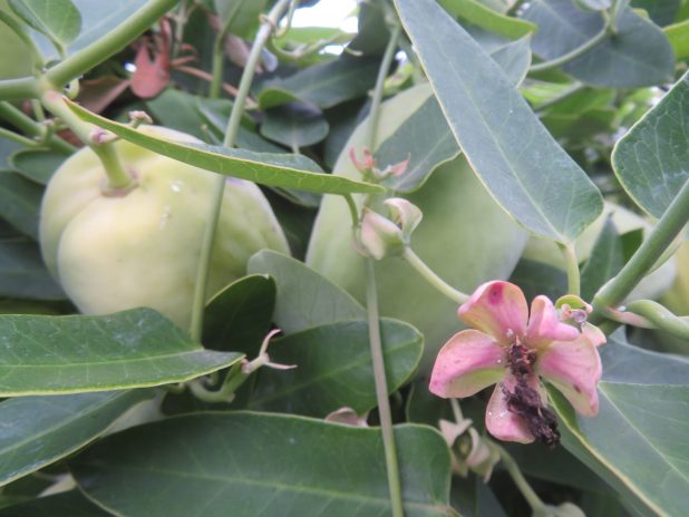 Fleur et fruits d’une plante cruelle, Araujia sericifera, la bien nommée, sur le grillage entourant la station météo, au parc Montsouris, 14e.