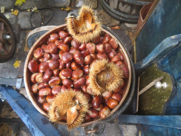 Délicieux marrons ( châtaignes ), Castanea sativa, en vente sur le parvis de l’église st Pierre de Montmartre, 18e.