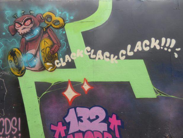 Petit singe mécanique, sur le mur à fresques de la rue Ordener, quartier de la Goutte d’Or, 18e.