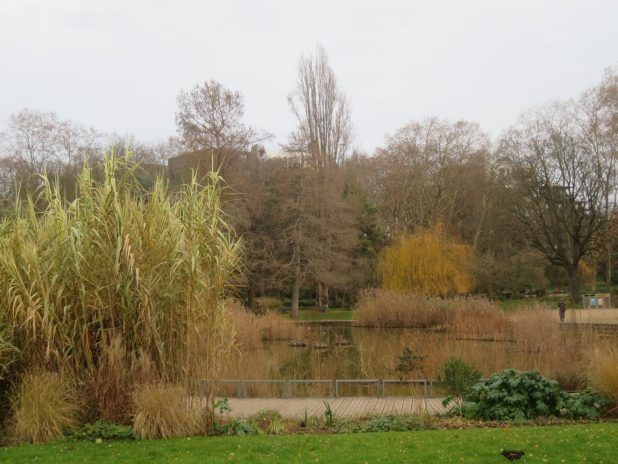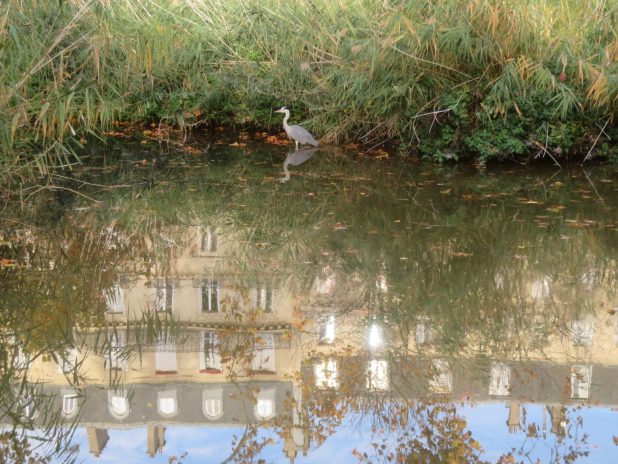 Localisation de cette pêche du héron cendré visible dans le reflet. Au square des Batignolles, 17e.