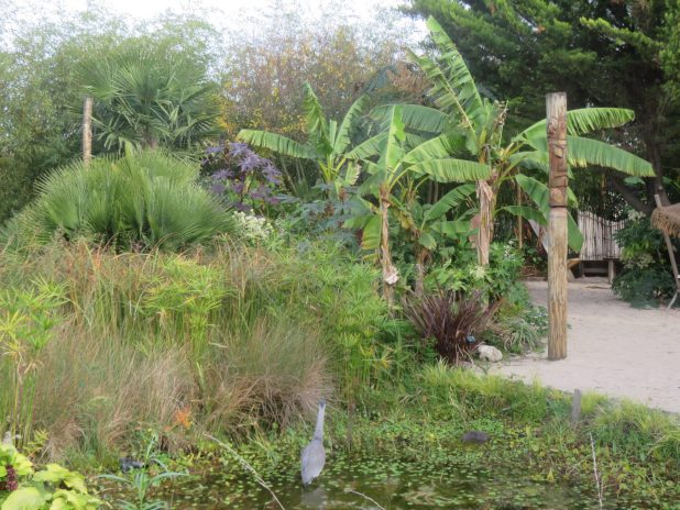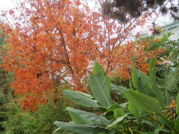 Erable en feu près d’un Musella lasiocarpa, derrière le palmarium du jardin d’Auteuil, 16e.