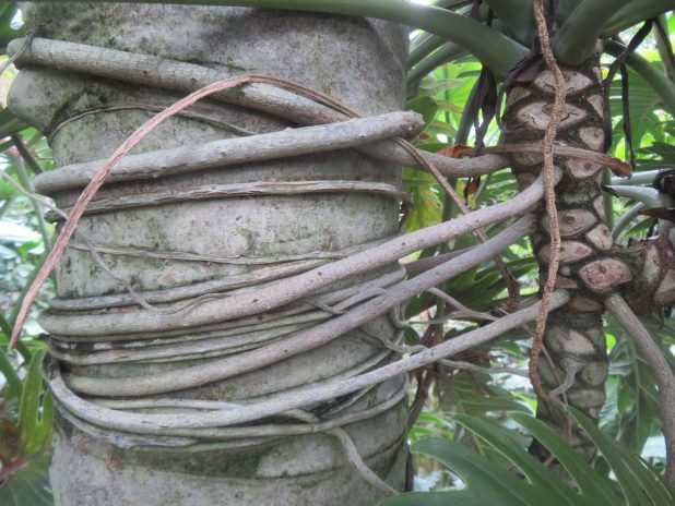 Baobab, Adansonia digitata, capturé par un Philodendron xanadu, dans une serre du jardin d’Auteuil, 16e.