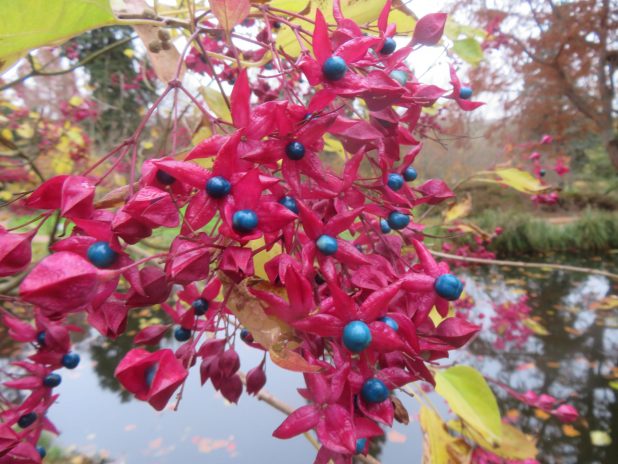 Fruits spectaculaires d’un Clerodendron trichotomum, à l’arboretum de la vallée aux Loups, 92.