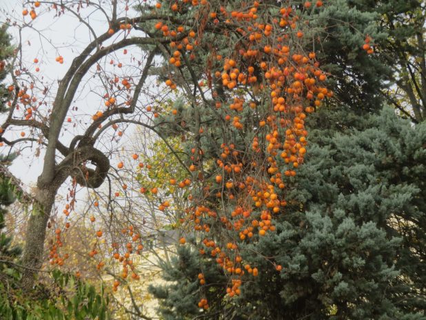 Dégringolade de fruits d’un plaqueminier, Diosyros kaki, sur le Champs de Mars, 7e.