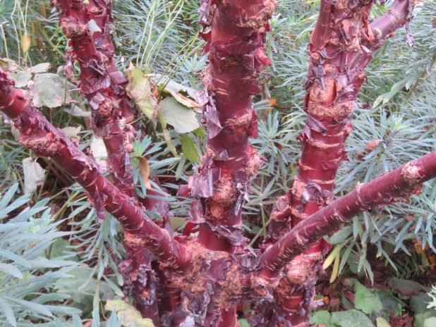Belles couleurs d’un « érable cannelle », à l’arboretum de la Vallée aux Loups, 92.