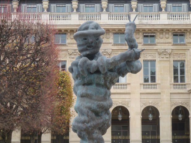 Le Letzer Geist ( Dernier fantôme ) de Thomas Schütte semble faire le V de la victoire. Exposé provisoirement dans le jardin du Palais Royal, Paris centre.