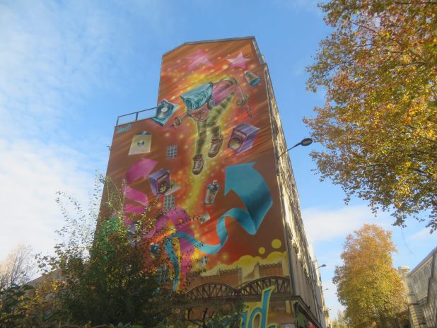 Pignon peint par Lazoo, né en 1969, au dessus du jardin partagé de Stalingrad, près du métro aérien, sur le parcours de la Promenade urbaine, 18e/19e.