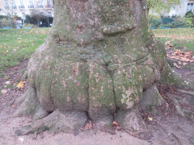 Impressionnant tronc de platane, Platanus X hispanica, au Parc Monceau, 17e.