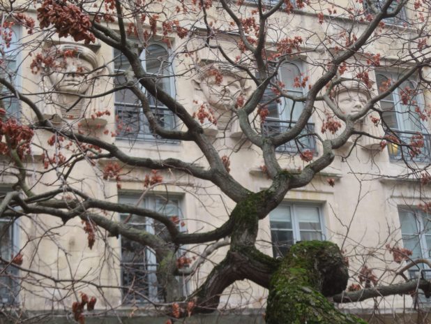 Trois visages de la déesse égyptienne Athor, derrière la ramure d’un savonnier de Chine, à l’entrée du passage du Caire, sur le parcours des passages couverts de l’Est, Paris centre.