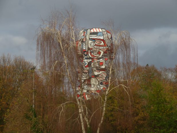 Tour aux figures de Jean Dubuffet, 1901-1985, derrière des bouleaux verruqueux, Betula pendula, au parc de l’Île st Germain, 92.