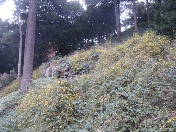Talus fleuri de jasmin d’hiver pour saluer l’arrivée du général météorologique, au parc des Buttes Chaumont, 19e.