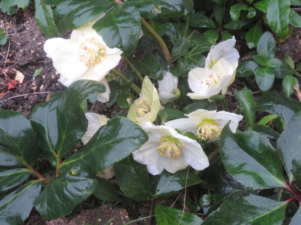 Rose de Noël, Helleborus niger, pressée de fleurir au jardin partagé » le Petit Paradis « , au cour de la balade dans le faubourg st Martin, 10e.