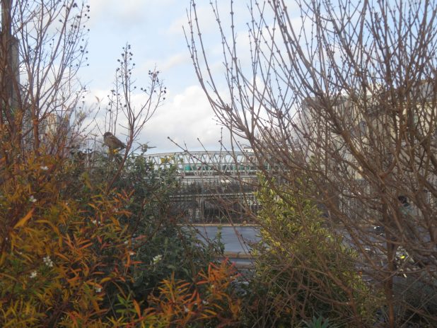Moineau, Passer domesticus, observant le passage du métro depuis la place Jan-Karski, sur le parcours de la promenade urbaine, 10e/18e/19e.