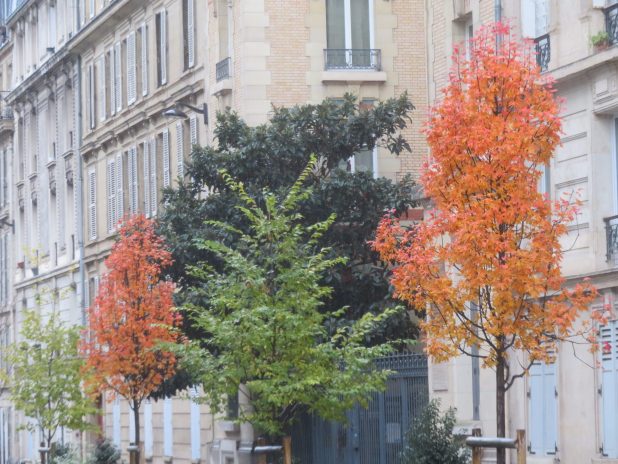 Joli assortiment d’arbres dans la rue Guy Patin, sur le parcours dans les jardins partagés du 18e arrondissement.